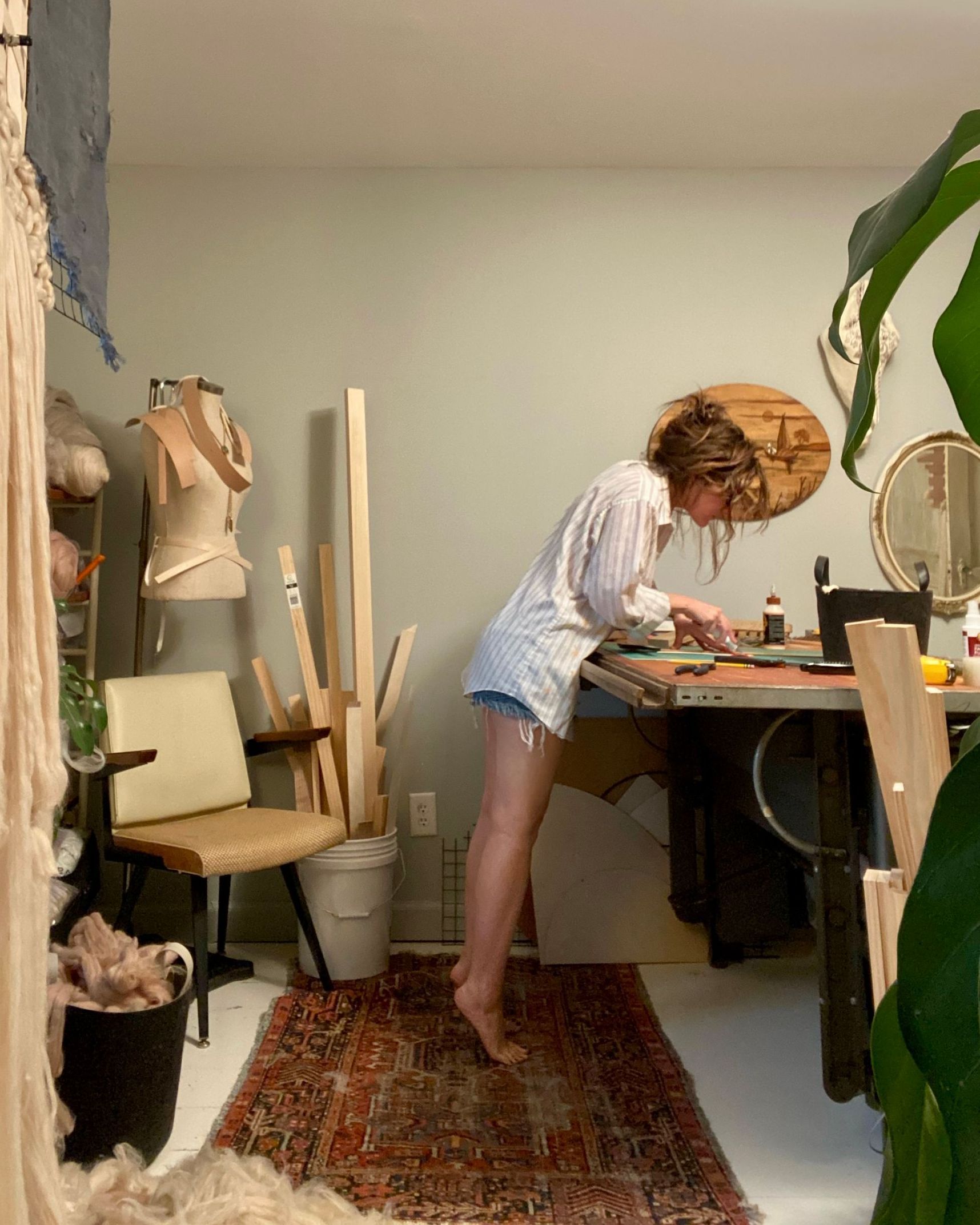 bedroom, Ali weaves on the tilted tabletop of a vintage drafting table, uses an antique